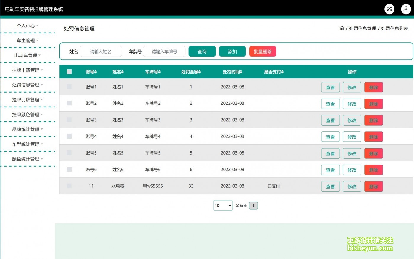 6.处罚信息管理:对车主的处罚信息进行添加,修改,删除,查询