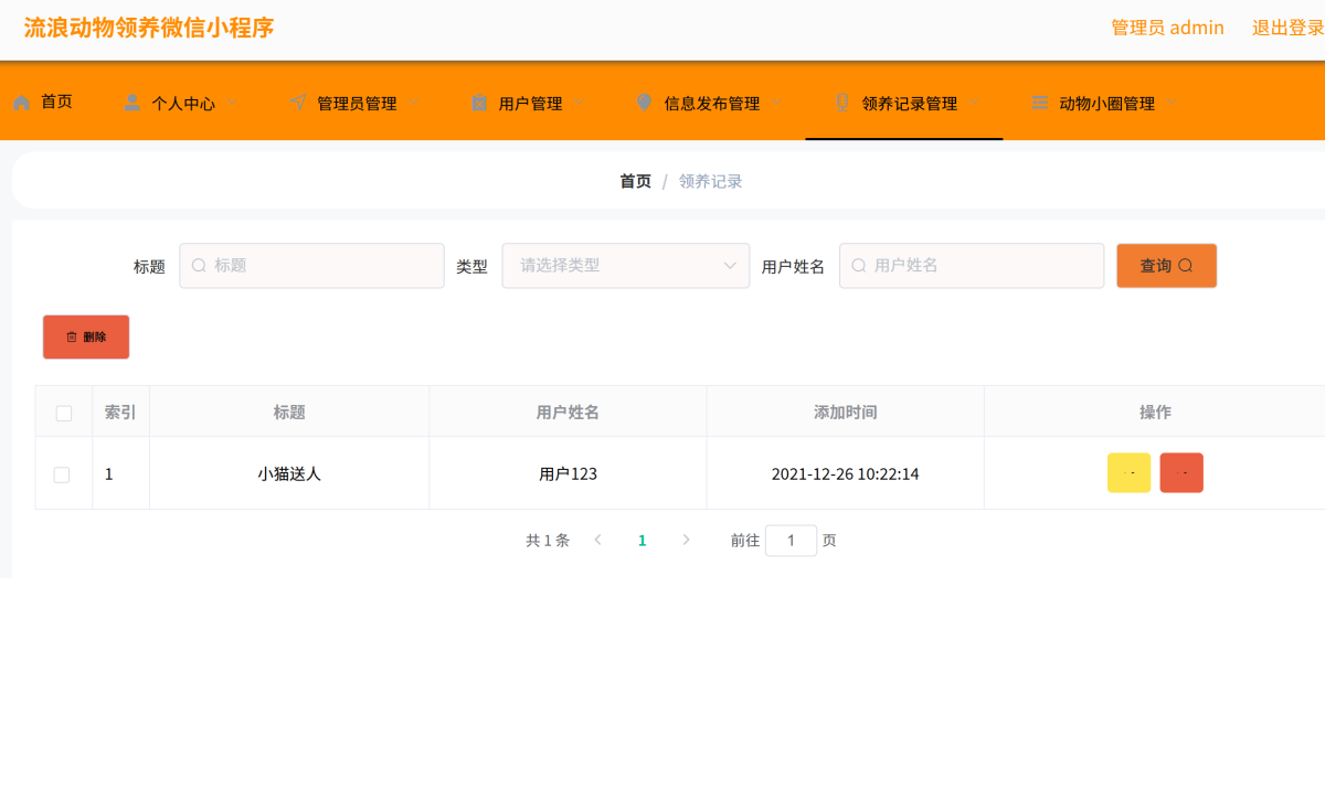 管理员查看所有用户的领养记录,支持审核领养申请和查看领养详情。