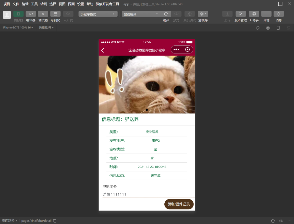 查看用户的领养记录,显示领养宠物的详细信息及领养状态。