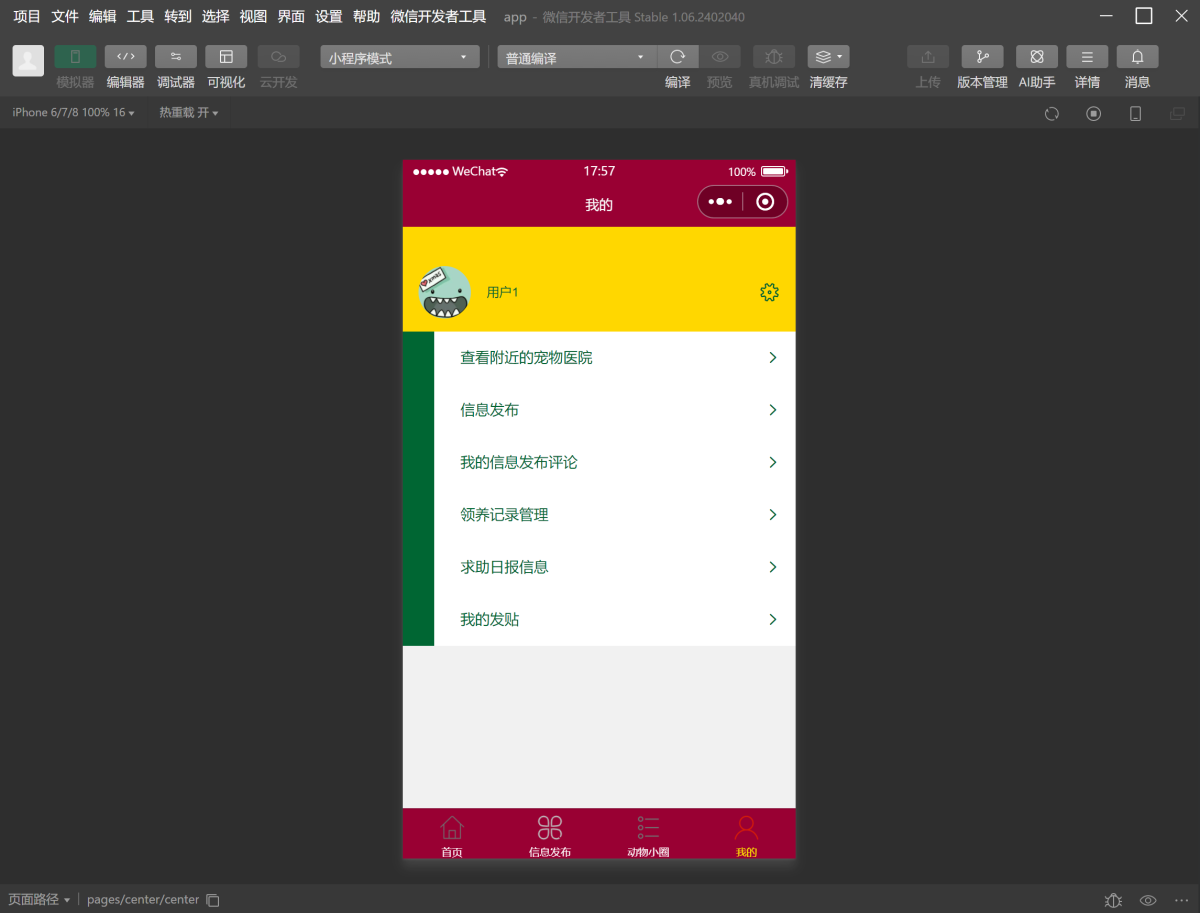 展示最新的信息发布、动物小圈动态和宠物医院推荐,用户可以浏览相关内容。