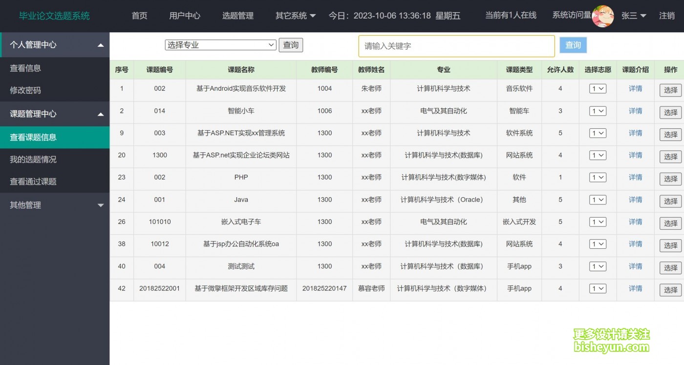基于php毕设双选管理系统----学生查看可以选的课题信息