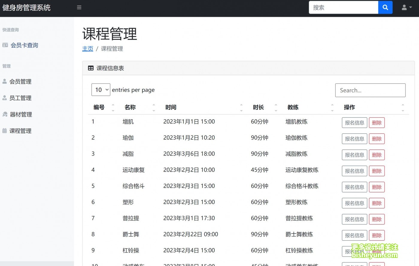 4.课程管理:管理员对健身房的课程信息进行添加,修改,删除,查询