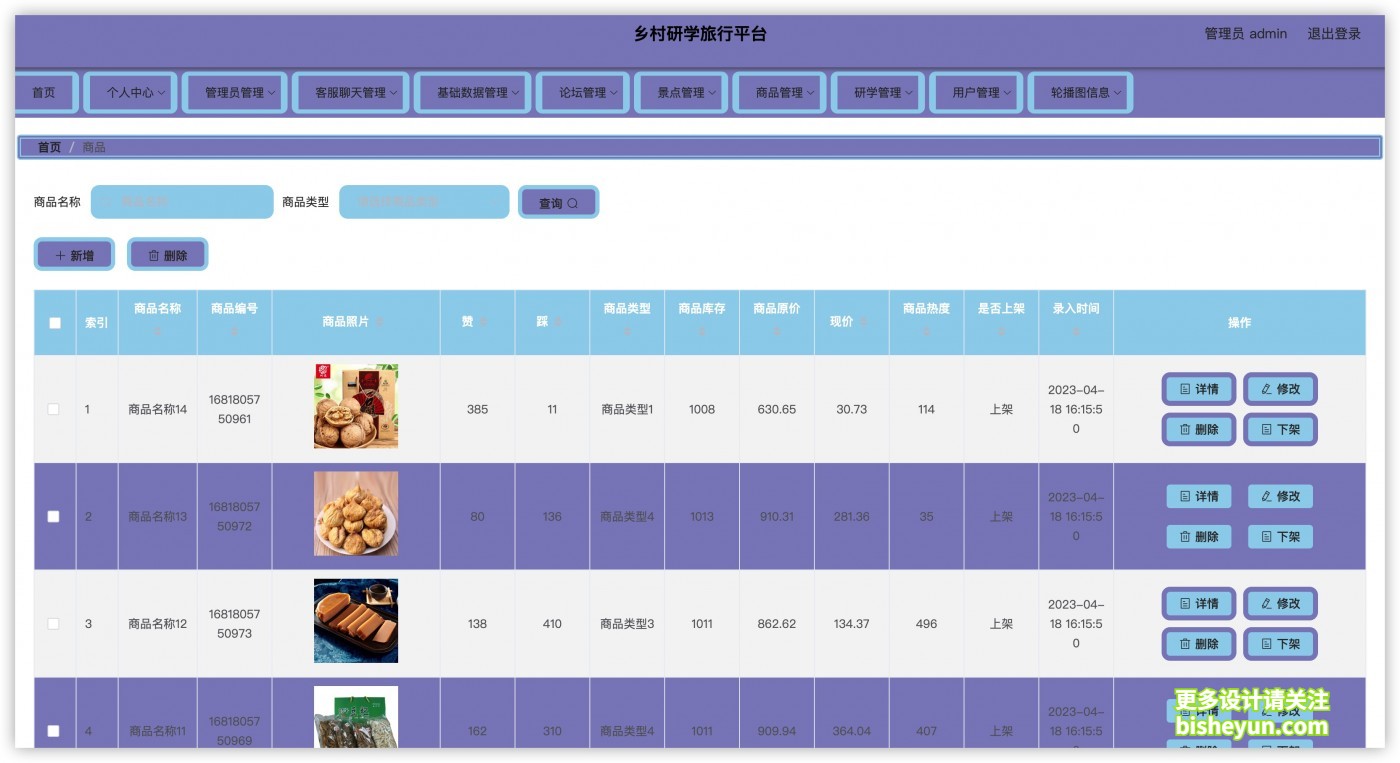 9.商品管理:管理员对研学的特产商品,商品评价进行添加,修改,删除,查询