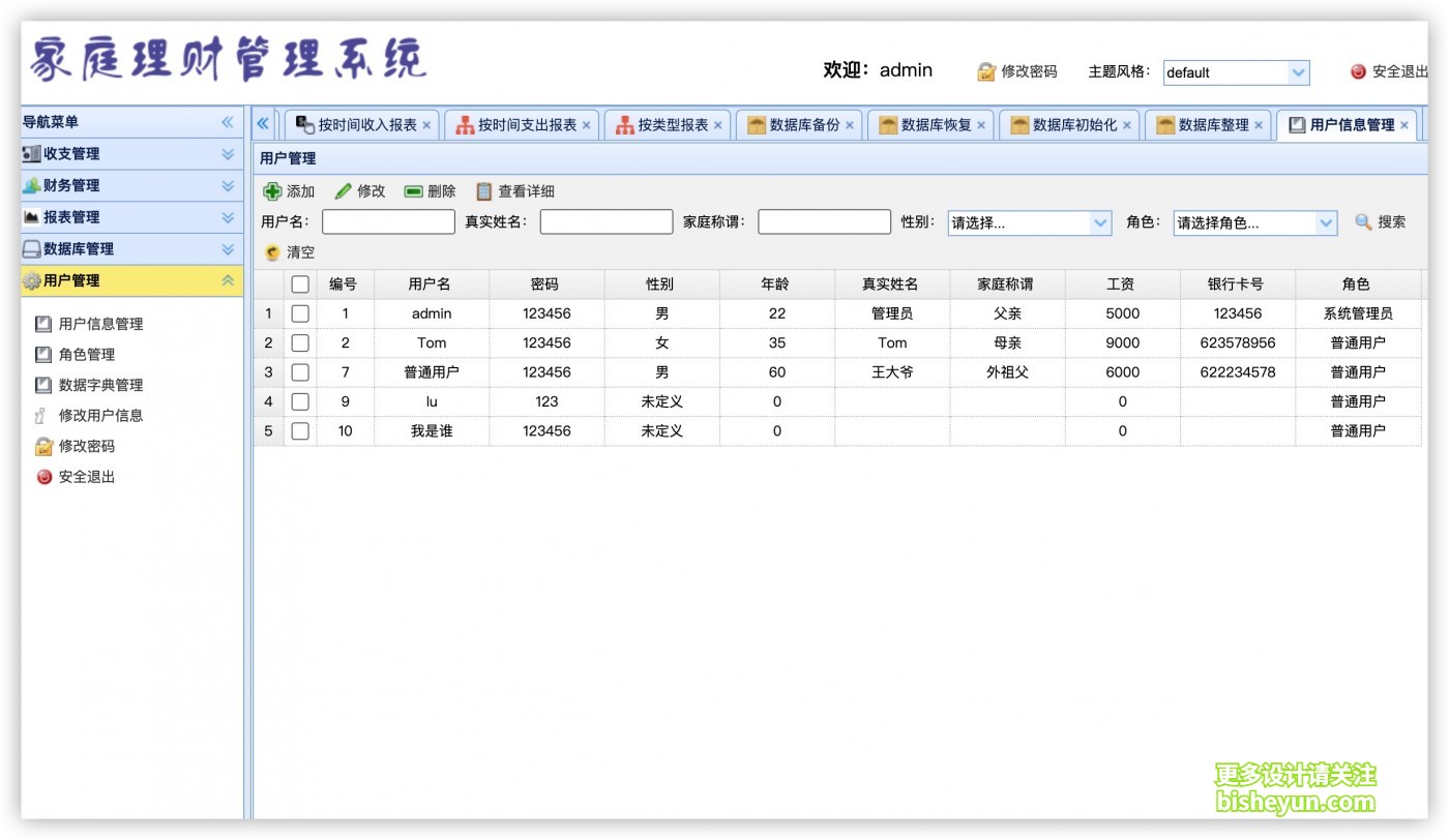 (1)用户信息管理(用户信息包括用户名、密码、性别、年龄、真实姓名、家庭称谓、工资、银行卡号)